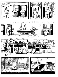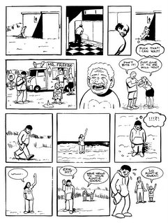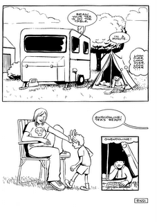 In hindsight these pages seem very 'Jimmy Corrigan' in tone (if not in execution) - I expect I was rereading the book at the time. Unfortunately there is a flaw in the main 'gag' on the top of the second page where its not clear that Timmy is concealing a jazz-mag in the comic to get a sly look (its also not clear that the mag is soap/shampoo themed). Once again the ending peters out inexplicably. This story was to originally appear in a large format 'Matter 3' along with the extended 'Touched' stuff elsewhere on the blog, hence the 4 stack panel layout.